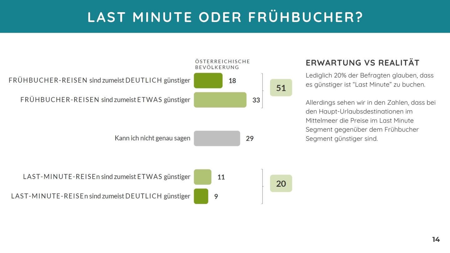 Laut Umfrage empfinden mehr als 50 Prozent der Österreicher:innen Frühbucher-Reisen als günstiger im Vergleich zu Last-Minute-Reisen. Gerade Personen, die längere Urlaubsreisen planen, sind davon überzeugt, dass frühzeitig buchen preisliche Vorteile bringt. Trotzdem schätzen 20% Last Minute Reisen als zumeist etwas oder deutlich günstiger ein. Ein von der Restplatzbörse durchgeführtes Preis-Monitoring ergibt hingegen: Je näher der Abreisetermin rückt, desto günstiger kann es werden, etwa wie im Falle eines 7-tägigen Urlaubes auf Rhodos. Der Preisvorteil zur frühen Buchung liegt hier bei ganzen 26%.