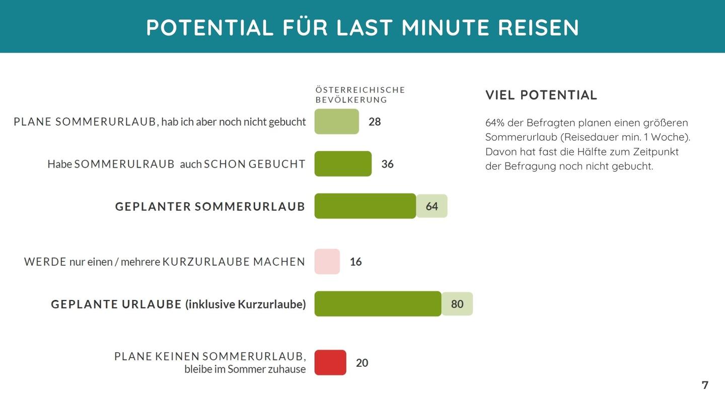 Trotz steigender Lebenserhaltungskosten und Teuerungen ist die Reiselust ungebrochen: Acht von zehn Befragten planen für 2025 einen Sommer- oder Kurzurlaub, besonders reiseaktiv sind Personen unter 50 Jahren, vor allem die Altersgruppe der 30- bis 49-Jährigen. Knapp 28% der befragten Personen haben zum Umfragezeitpunkt Anfang Mai noch nicht gebucht, 29 % aus dieser Gruppe planen acht Wochen oder früher vor Abreise zu buchen, 31 % entscheiden sich vier bis acht Wochen vorher und 26% aus dieser Gruppe buchen Last-minute (4 Wochen oder weniger vor Reiseantritt). Die Zahlen zeigen, der Markt bleibt auch kurzfristig dynamisch. Männer und Berufstätige zeigen sich in ihrer Buchungsbereitschaft zurückhaltender und sind demnach für Last Minute offen. Jüngere Menschen tendieren ebenso eher zu spontanen Buchungen, während ältere Zielgruppen planungsorientierter sind.