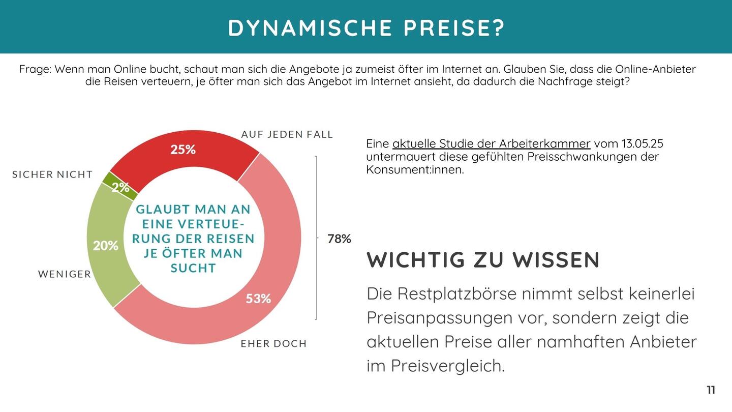 Rund 60 % der Sommerurlauber:innen vergleichen regelmäßig Angebote unterschiedlicher Anbieter – besonders häufig trifft das auf Online-Bucher:innen, Männer, Städter sowie die Altersgruppe der 40- bis 49-Jährigen zu. Preisbewusstsein ist damit ein entscheidender Faktor bei der Reiseplanung. Transparente Preisstrukturen, Vergleichsfunktionen und Filteroptionen schaffen Vertrauen und erleichtern die Entscheidung. Die Plattform von restplatzboerse.at bündelt Angebote aller namhaften Veranstalter und ermöglicht so einen einfachen und schnellen Überblick – ideal für preisbewusste Reisende, die flexibel bleiben wollen.