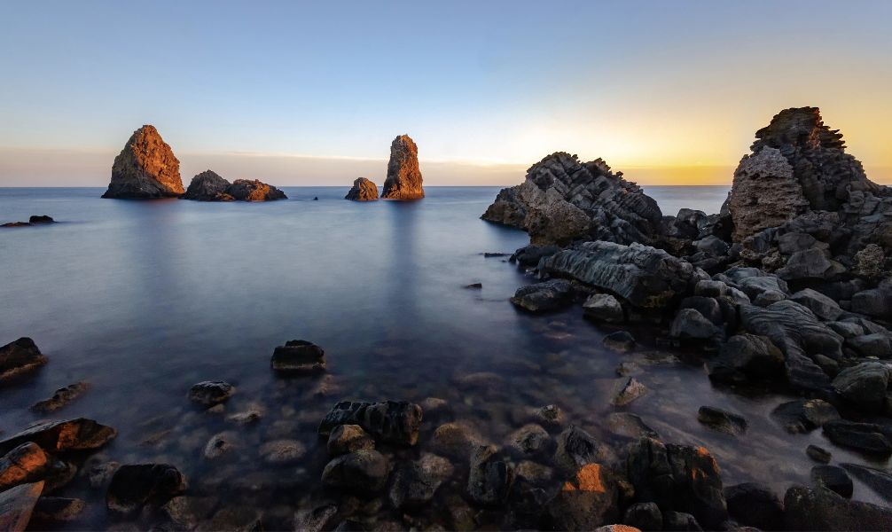 Dieser Strand ist zwar kein klassischer Badestrand, ein Besuch sollte aber bei deinem Sizilien Urlaub nicht fehlen. Den felsigen Lavastrand umgibt eine mythische Aura. Man sagt, dass Odysseus hier von einem Zyklopen floh, der mit einem großen Felsbrocken nach ihm warf – daher auch der Name. Besonders schön ist die Stimmung an der Riviera dei Ciclopi zum Sonnenaufgang bzw. -untergang.
