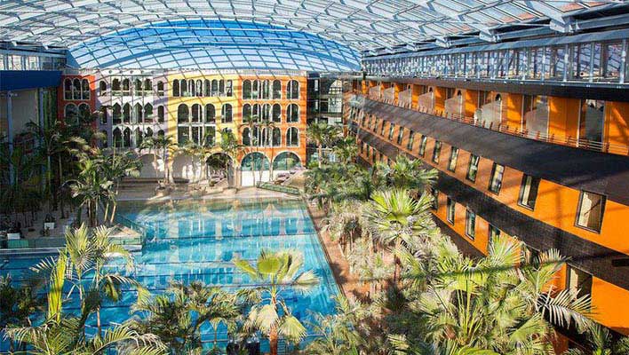 Ich beginne meine Aufzählung gleich mal mit dem Nonplusultra des Wasserspaßes: Dem Victory Hotel der Therme Erding. Mit 185.000 Quadratmetern ist die Therme die größte der Welt und bringt dir ein Südseefeeling durch echte Palmen und die verglaste Dachkuppel.
