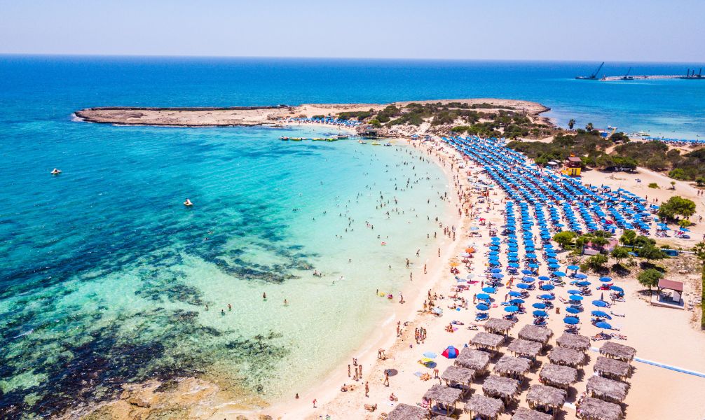 Nissi Beach ist der bekannteste und beliebteste Urlaubsstrand Zyperns im östlichen Mittelmeer. Er liegt in Nissi Bay, am westlichen Rand des populären Urlaubsorts Ayia Napa und ist leicht zu erreichen. Tagsüber legen DJs in den Strandbars auf und es wird zwischen den Liegen und im Wasser getanzt. Aber keine Sorge, auch wer es ruhiger angehen möchte, findet ausreichend Platz in den Randbereichen des Strandes. Denn am Nissi Beach gibt es nicht nur Partystimmung für die jüngeren Generationen, sondern auch Aktivitäten für Familien. Obwohl es keine speziellen Kinderangebote gibt, fühlen sich auch Familien sehr wohl hier und genießen das freundliche Miteinander zwischen Jung und Alt.