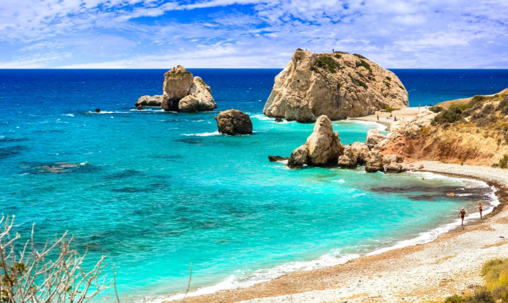 Der Petra tou Rimou Strand, südöstlich der Region Paphos, gilt laut der griechischen Mythologie als der Geburtsort der Aphrodite. Zahlreiche Urlauber:innen besuchen deshalb diesen Kieselstrand, an dem die Göttin aus dem Wasser gestiegen sein soll und ihre magische Liebe und Schönheit verbreitet hat. Der Strand ist weitläufig, bietet viel Platz und beeindruckt nicht nur aufgrund der Mythologie, sondern auch mit seiner natürlichen Schönheit. Legenden besagen, dass man das Glück der ewigen Liebe finden kann, indem man den Felsen von Romiou dreimal umrundet.