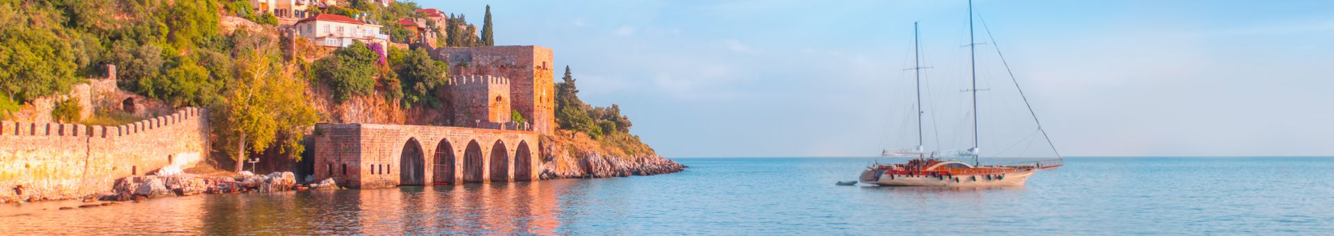 Hoch über der Stadt Alanya thront die mächtige Festung, die aus der Zeit der Seldschukenherrschaft im 13. Jahrhundert stammt. Sie wirkt mit ihren Türmen und Zinnen sehr eindrucksvoll und bietet einen herrlichen Ausblick auf den Hafen von Alanya. Unterhalb des Burgbergs steht der Rote Turm, der im Jahr 1226 zur Verteidigung der nahegelegenen Schiffswerft errichtet wurde.